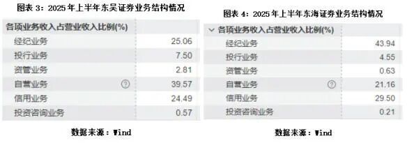 وفقًا لبيانات Wind، في النصف الأول من 2025، شكلت إيرادات الأعمال الذاتية لدونغ وو 39.57%، وإيرادات الوساطة والائتمان 49.55%، بينما كانت إيرادات الاكتتاب 7.5%. أما دونغهاي، فكانت نسبة إيرادات الأعمال الذاتية 21.16%، وإيرادات الوساطة والائتمان 73.44%، والاكتتاب 4.55%.