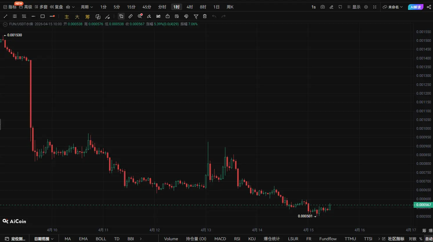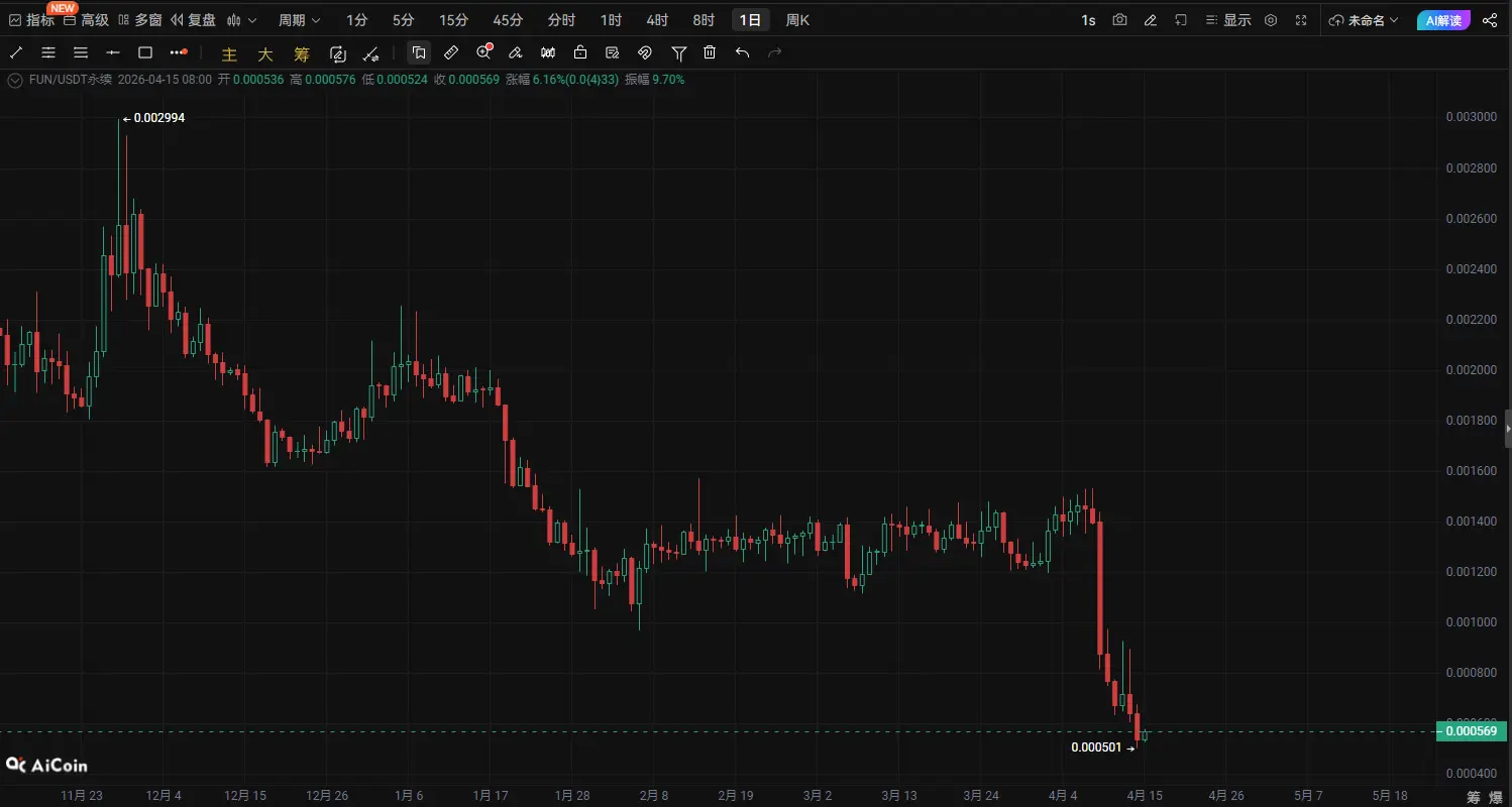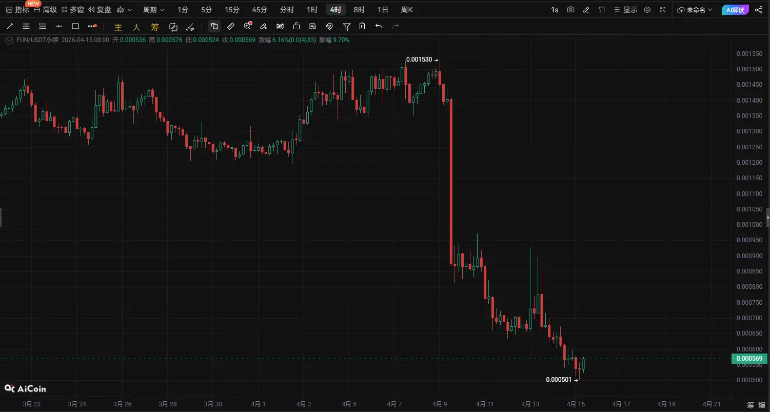 عملة FUN على وشك الانطلاق! 0.00057 تشكل خط دفاع رئيسي بين الصعود والهبوط، وربما يقوم اللاعبون الرئيسيون بتحضير موجة مضاعفة|تحليل تقني عميق في 15 أبريل