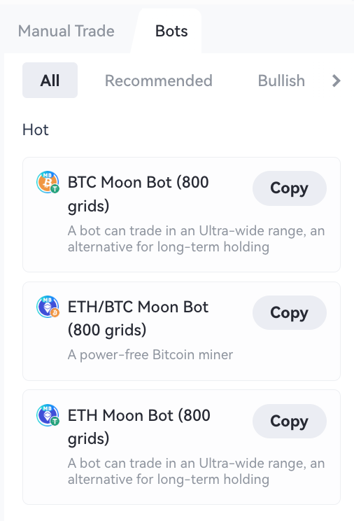 Inversores que buscan configuraciones estables y rentabilidades relativamente más altas: la estrategia del bot Moon ETH/BTC ofrece oportunidades de ingresos relativamente estables, mitigando el riesgo de fluctuaciones de precios de activos únicos, lo cual puede no ser adecuado para inversores que no pueden tolerar la extrema volatilidad del mercado o pérdidas significativas.