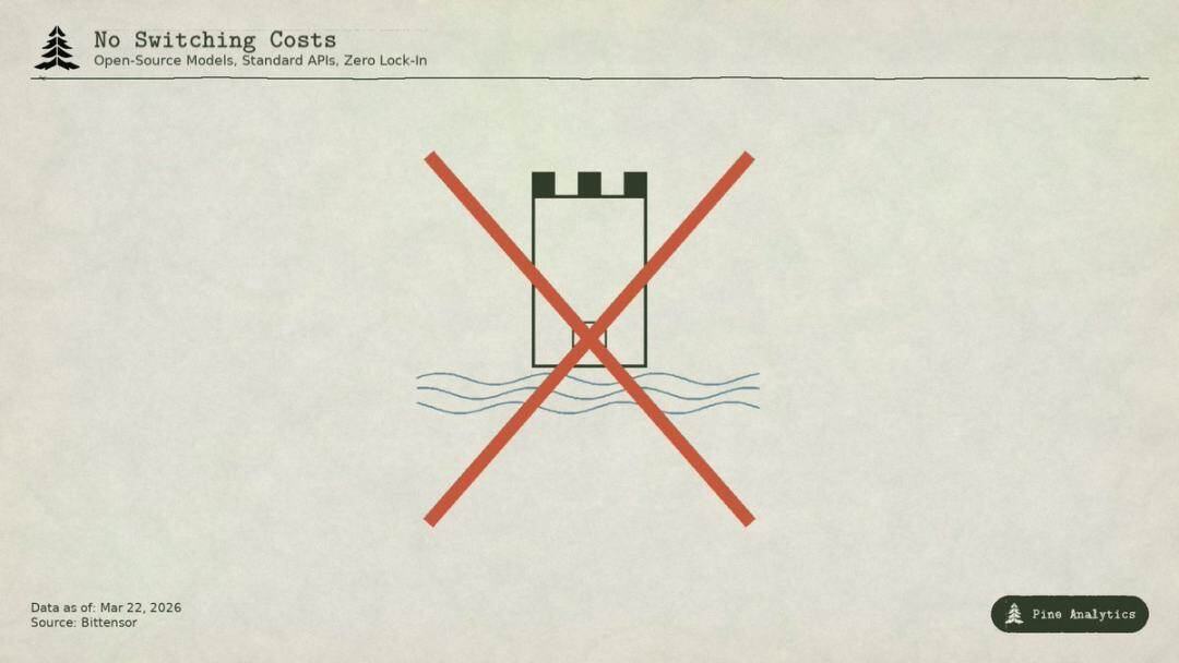 Beberapa orang membandingkan ini dengan insentif awal internet untuk menarik pengguna, tetapi Uber, DoorDash, dan AWS membangun biaya switching selama masa subsidi: platform eksklusif, jaringan pengemudi, ekosistem perusahaan. Sedangkan subnet Bittensor tidak memiliki hambatan apa pun: model sumber terbuka, antarmuka standar, pengguna dapat beralih penyedia layanan tanpa biaya. Setelah subsidi berakhir, tidak ada mekanisme penguncian yang mampu mempertahankan pengguna.