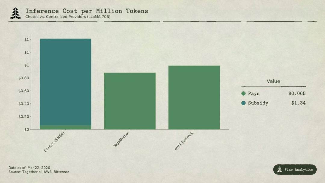 Ini berarti, tanpa subsidi, harga Chutes akan 1,6–3,5 kali lebih mahal daripada solusi terpusat. Keunggulan biaya 85% yang diklaim sepenuhnya terbalik; harga murah mereka sebenarnya didukung oleh pembelian inflasi oleh pemegang TAO, bukan efisiensi struktural dari desentralisasi.
