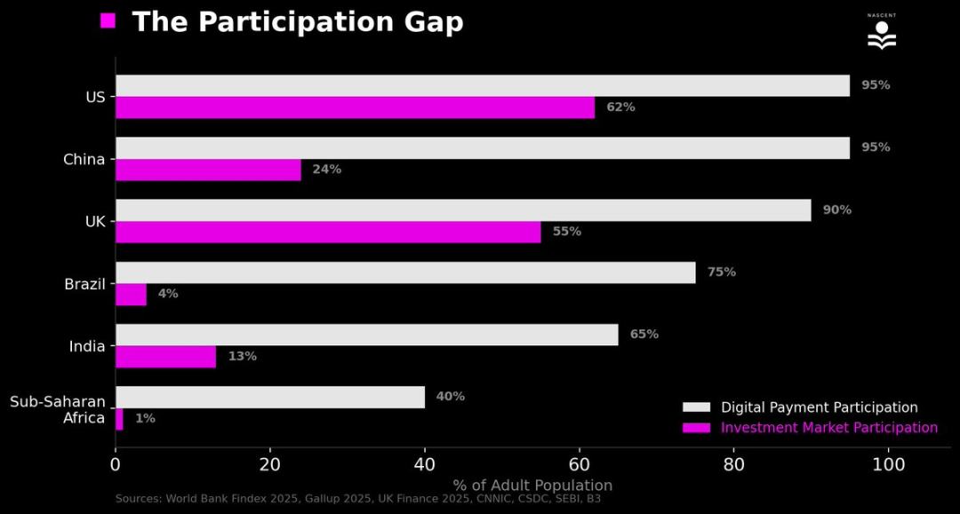 Bisa terlihat dari perbandingan tingkat partisipasi: bahkan di negara dengan penetrasi investasi tertinggi, hanya sekitar setengah populasi yang berpartisipasi dalam pasar investasi dalam beberapa bentuk, sedangkan penetrasi pembayaran digital mencapai 95%.