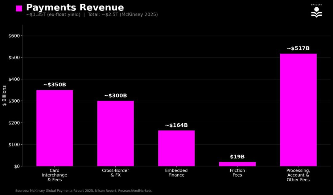 Laporan McKinsey《Laporan Pembayaran Global 2025》menunjukkan bahwa pendapatan pembayaran global sekitar 2,5 triliun dolar AS. Namun, hampir setengahnya (sekitar 1,15 triliun dolar AS) adalah pendapatan bunga bersih: bank dan akun pembayaran memperoleh keuntungan dari dana yang mengendap di sela-sela transaksi. Ini lebih mirip pendapatan dari dana yang menganggur, bukan sekadar biaya layanan pembayaran. Setelah mengeluarkan bagian ini, pendapatan inti pembayaran yang tersisa—yang berasal dari transfer dana, biaya pertukaran, biaya pemrosesan, layanan keuangan tertanam (Shopify, pembayaran cicilan, Stripe) serta biaya berbasis gesekan (ATM, cerukan, biaya on-chain)—masih sekitar 1,35 triliun dolar AS.