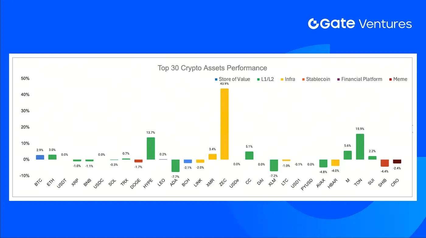 Di antara aset utama, ZEC tampil menonjol didukung oleh alokasi aset privasi dari Grayscale; TON naik karena upgrade besar jaringan (meningkatkan kecepatan dan finalitas).