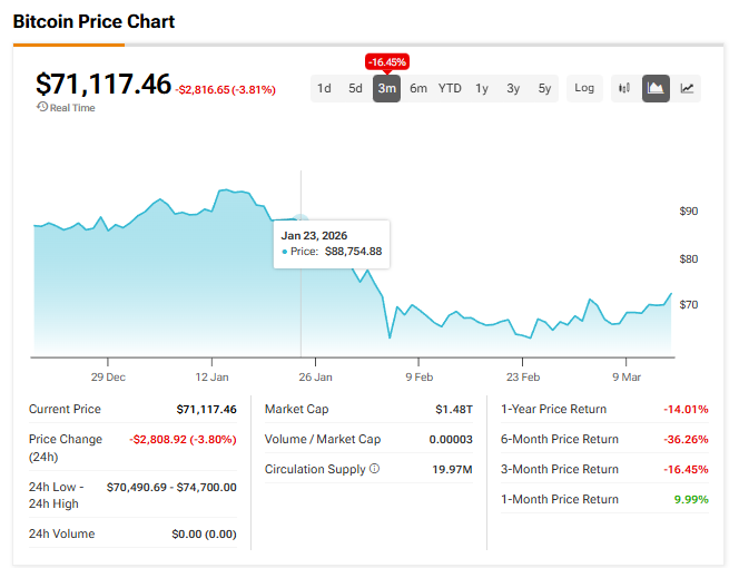 ビットコイン(BTC)の価格は4.70%▼下落し、米連邦準備制度理事会(FRB)のジェローム・パウエル議長が利下げの期待を打ち砕いたことで、5%下落して70,000ドルで取引されています。### 70%オフのTipRanksプレミアムを今すぐ利用* ヘッジファンドレベルのデータと強力な投資ツールを解放し、より賢く鋭い意思決定をサポート * 最新のニュースと分析で市場を先取りし、ポートフォリオの潜在能力を最大化米中央銀行は、今年後半にわずか1回の25ベーシスポイントの利下げしか見込んでいません。これはビットコインやその他の暗号通貨にとって悪いニュースです。リスク資産である暗号通貨は、金利が低いときにパフォーマンスが良くなる傾向があります。多くの暗号通貨強気派は、低金利をBTCやその他のデジタル資産のきっかけと見ていましたが、これらは昨年10月以降、暗号冬の影響を受け続けています。ビットコインの価格は2025年10月初旬に過去最高値の12万6,000ドルを超えましたが、それ以降苦戦しています。**ビットコインの苦難**-----------------------ビットコインは過去1週間で回復の兆しを見せ、価格は75,000ドルまで上昇しました。一部の市場関係者は、価格が重要なサポートレベルの75,000ドルを維持すれば、BTCがブレイクアウトすると予想していました。しかし、最新のFRBの政策会合後、ビットコインの価格は再び下落しています。イーサリアム(ETH)-5.82%▼やドージコイン(DOGE)も、FRBが基準金利を現行の3.50%-3.75%の範囲に維持し、利下げ見通しを引き下げたことで後退しています。中央銀行は2027年に1回だけ25ベーシスポイントの利下げを見込んでいます。ETHとDOGEは、それぞれ6%下落しています。**BTCの過去3か月のパフォーマンス**-----------------------------------以下のチャートは、ビットコインが近頃苦戦しており、2025年10月から始まった暗号通貨の売りが続く中、過去12週間で16.45%下落したことを示しています。免責事項・開示報告書 問題を報告