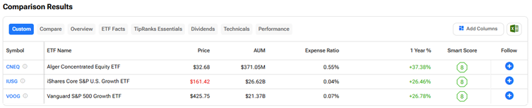 ここでは、アウトパフォーム評価を受け、少なくとも10%の上昇余地が見込まれる3つのETFについて紹介します:アルジェ・コンセントレイテッド・エクイティETF(CNEQ) -1.22% ▼、iShares Core S&P U.S. Growth ETF(IUSG) -1.20% ▼、バンガードS&P 500グロースETF(VOOG) -1.28% ▼。