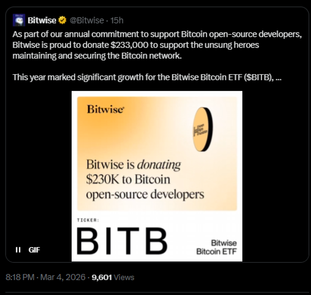 A Bitwise doou $233K aos desenvolvedores do Bitcoin Core. A doação anual tem como objetivo apoiar o desenvolvimento contínuo do Bitcoin e ajudar os desenvolvedores a manter e proteger a rede Bitcoin.