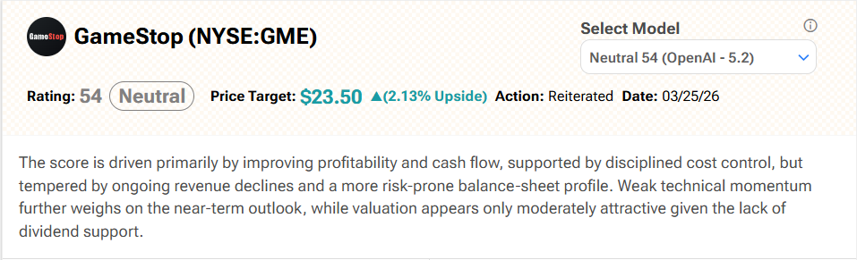 Обратимся к Уолл-стрит: традиционное аналитическое покрытие GameStop недостаточно. К счастью, AI-аналитик TipRanks Spark взял это на себя. Spark оценивает акции GME как нейтральные с целевой ценой 23,50 доллара. В качестве причин он указывает «улучшение прибыльности и денежного потока, поддерживаемое дисциплинированным контролем затрат, но сдерживаемое продолжающимся снижением доходов и более рискованным профилем баланса».