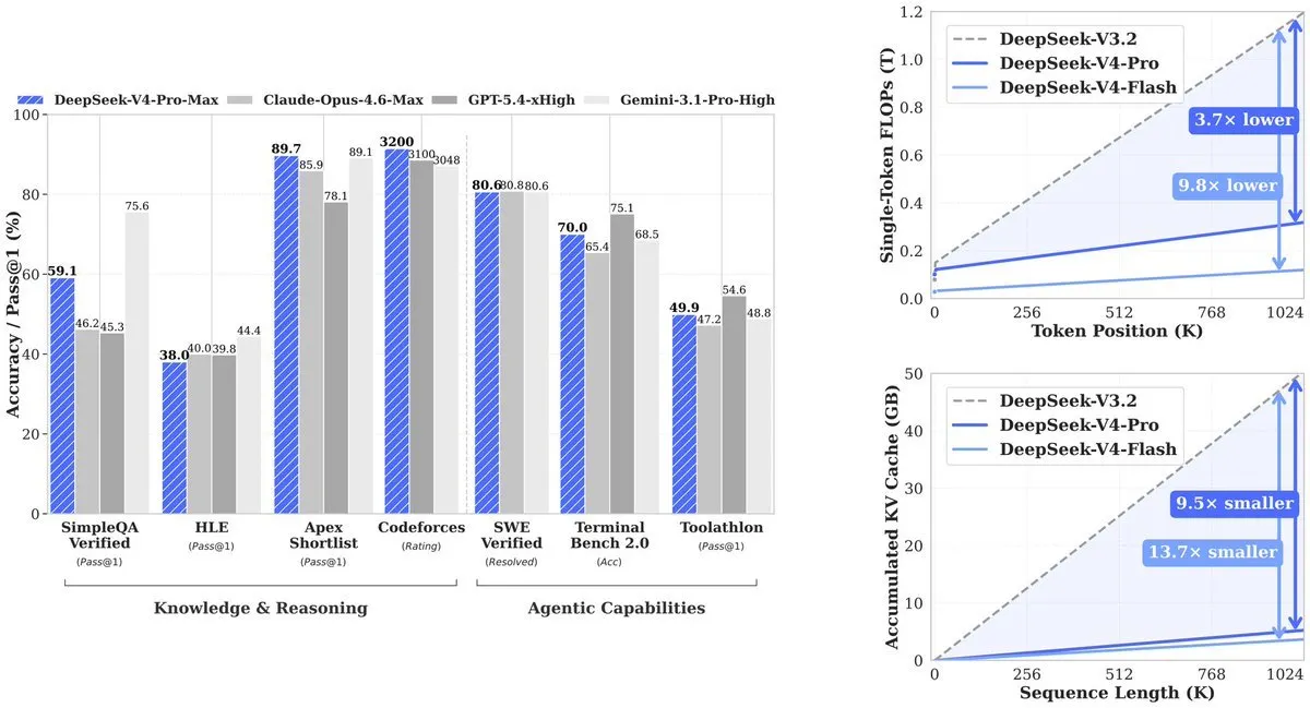 Где она отстает: тест многозадачности MMLU-Pro (Gemini-3.1-Pro при 91,0% против 87,5%), тест экспертных знаний GPQA Diamond (Gemini 94,3 против 90,1), и Экзамен человечества, тест уровня магистратуры, где Gemini-3.1-Pro с 44,4% все еще превосходит V4-Pro с 37,7%. Особенно по длинному контексту, V4-Pro лидирует среди моделей с открытым исходным кодом и побеждает Gemini-3.1-Pro на бенчмарке CorpusQA (имитирующем реальный анализ документов на миллион токенов), но уступает Claude Opus 4.6 на MRCR — тесте, измеряющем, насколько хорошо модель может найти конкретные иголки, спрятанные в очень длинной сене.