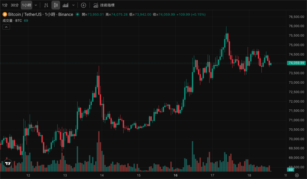 Bitcoin hit a 24-hour low of $73,399 at 21:00 Taiwan time on 03/17, then gradually rebounded, reaching a intraday high of $74,894 at 23:00 on 03/17. Overall volatility stayed within 2%. As of writing, BTC is at $74,004, up 0.06% in 24 hours, with a 24-hour trading volume of about $1.31 billion. The trend is sideways.
