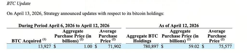 On April 13, 2026, Strategy submitted an 8-K filing to the U.S. Securities and Exchange Commission revealing a set of data that has garnered widespread market attention: the company purchased approximately 13,927 bitcoins between April 6 and April 12, at an average price of about $71,902. As a result, Strategy’s total bitcoin holdings reached 780,897 coins, with a cumulative purchase cost of approximately $59.02 billion, and an average holding cost of about $75,577 per coin.