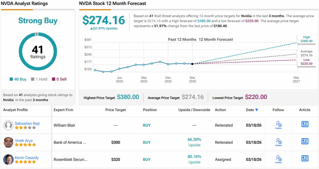 На іншому боці вулиці MU має ще 38 рекомендацій «Купити» та 1 рекомендацію «Утримувати», що дає загальний рейтинг Strong Buy. Середня цільова ціна становить $274.16, що враховує 52% прибутку за 12 місяців. (Див. Прогноз акцій NVDA)