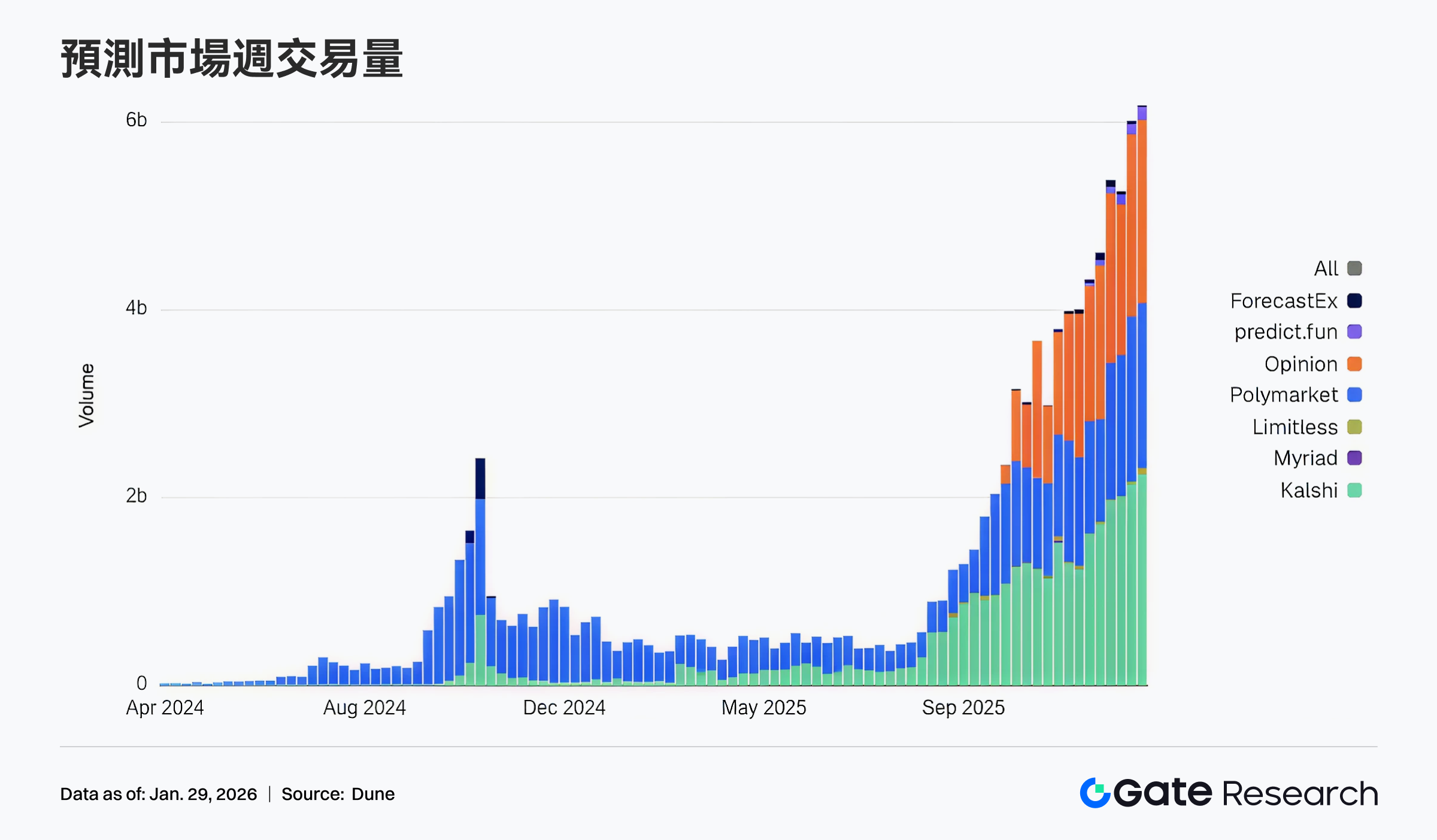 Dune 數據顯示,過去一年多來,預測市場(Prediction Markets)週度名義交易量出現顯著結構性躍升,尤其自 2025 年下半年起進入加速成長階段,總週交易量已由早期數億美元攀升至近 60 億美元歷史高點。Polymarket、Kalshi、Myriad 等平台為主要增量來源,疊加 ForecastEx、predict.fun 等新平台加入,整體賽道呈多平台共振式放量。