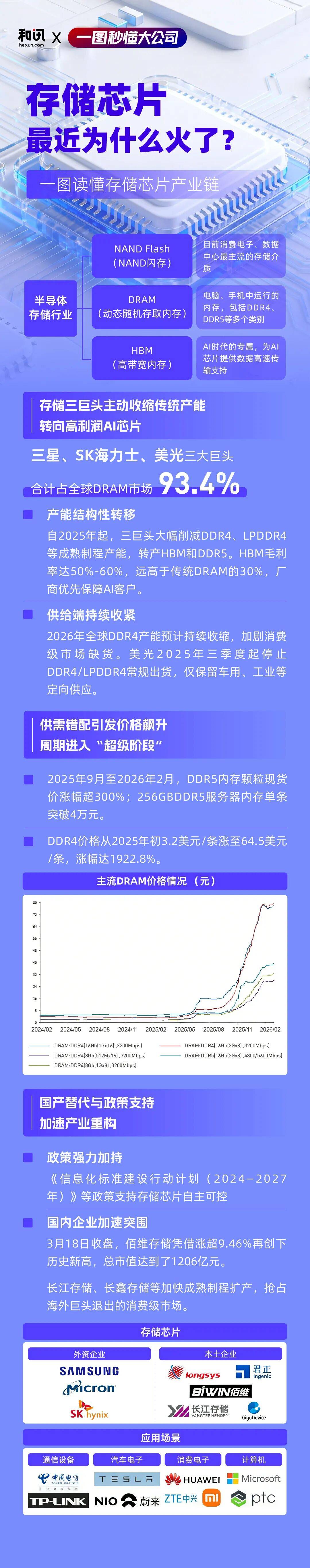 這一波爆發的根源,仍然是全球存儲市場的產能轉移。在存儲產業中,有NAND Flash(NAND閃存)、DRAM(動態隨機存取內存)和HBM(高帶寬內存)幾大核心品類。DRAM內存主要供向了電腦、手機中運行的內存,包括DDR4、DDR5等多個類別。HBM(高帶寬內存)芯片更昂貴,且更適配AI數據中心。