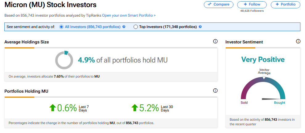 美光在散戶投資者中仍然受到廣泛持有。根據TipRanks的數據,大約4.9%的投資組合持有MU,平均配置為7.65%。
