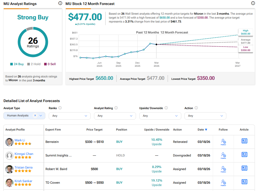 根據TipRanks,華爾街對美光的評級為“強烈買入”,基於24個買入和2個持有的建議。平均12個月的目標價為473美元,預示著2.44%的上行潛力。