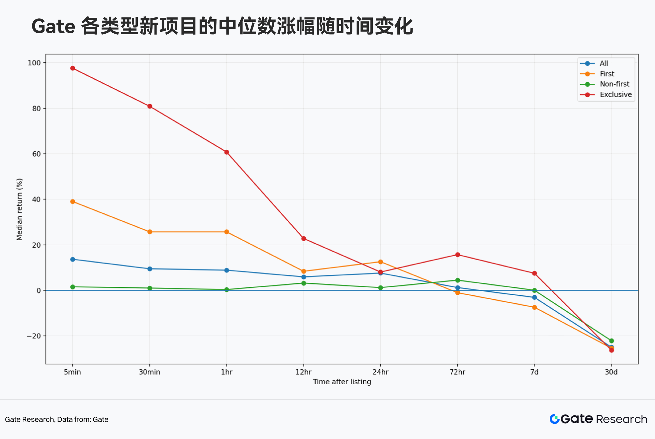 从中位数收益的时间序列看,Gate 不同类型的新项目在上线后早期窗口呈现出清晰分层:首发项目,特别是独家项目,在 5 分钟—24 小时的多个时间节点上维持更高的中位数收益水平;非首发项目的中位数整体更贴近零轴。随着窗口延长至 72 小时及之后,中位数普遍走弱并逐步趋同。