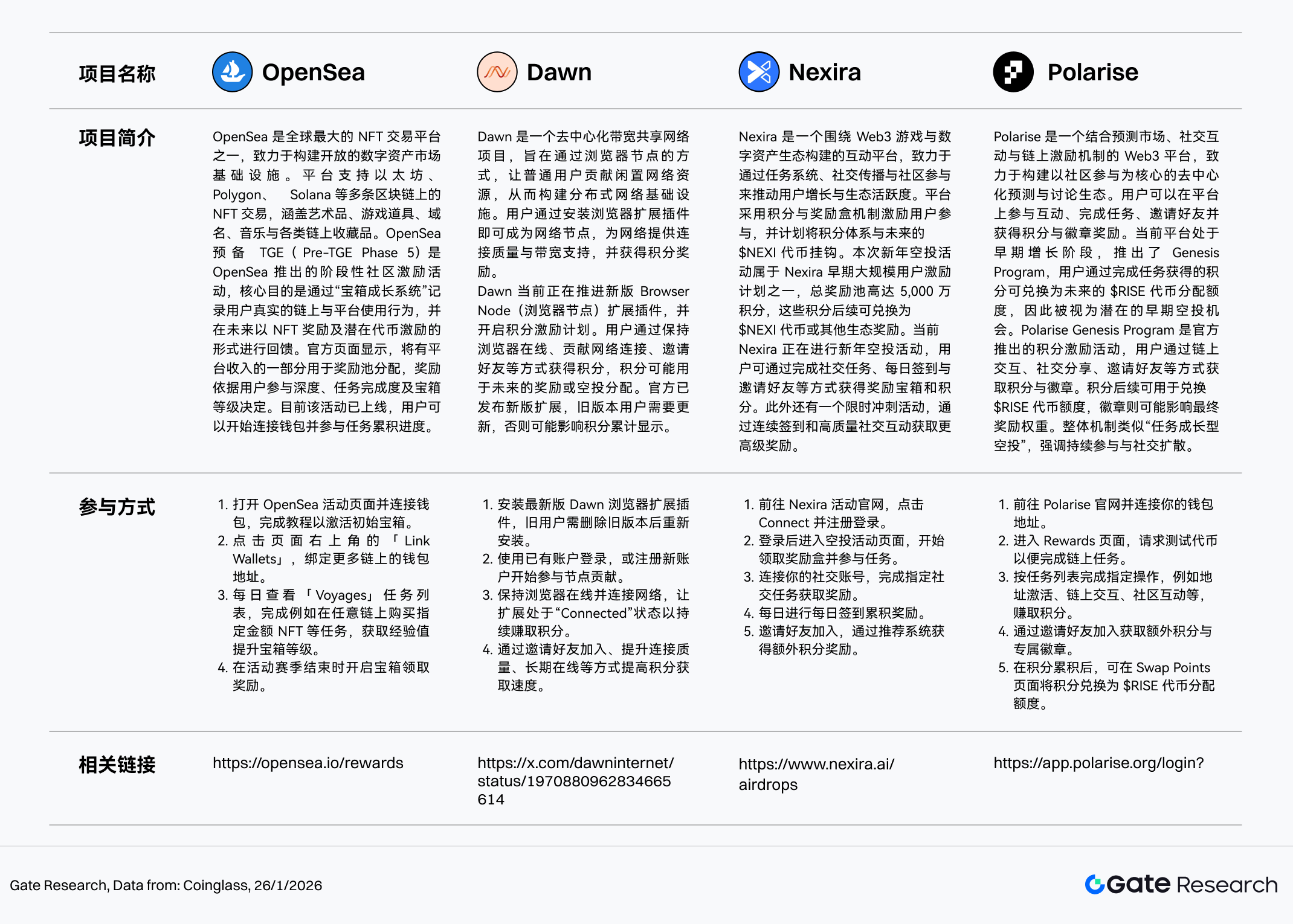 此外,本期重点追踪的 OpenSea、Dawn、Nexira 与 Polarise 均处于活跃激励阶段,分别覆盖 NFT 平台行为奖励、去中心化带宽节点、社交裂变积分体系与预测市场型社区生态,定位互补、参与路径清晰。用户可通过链上交互、社交绑定、邀请与签到等方式持续累积积分、徽章或宝箱等级,从而提升未来潜在空投与代币激励权重。建议持续跟进活动更新,强化早期与长期参与记录。