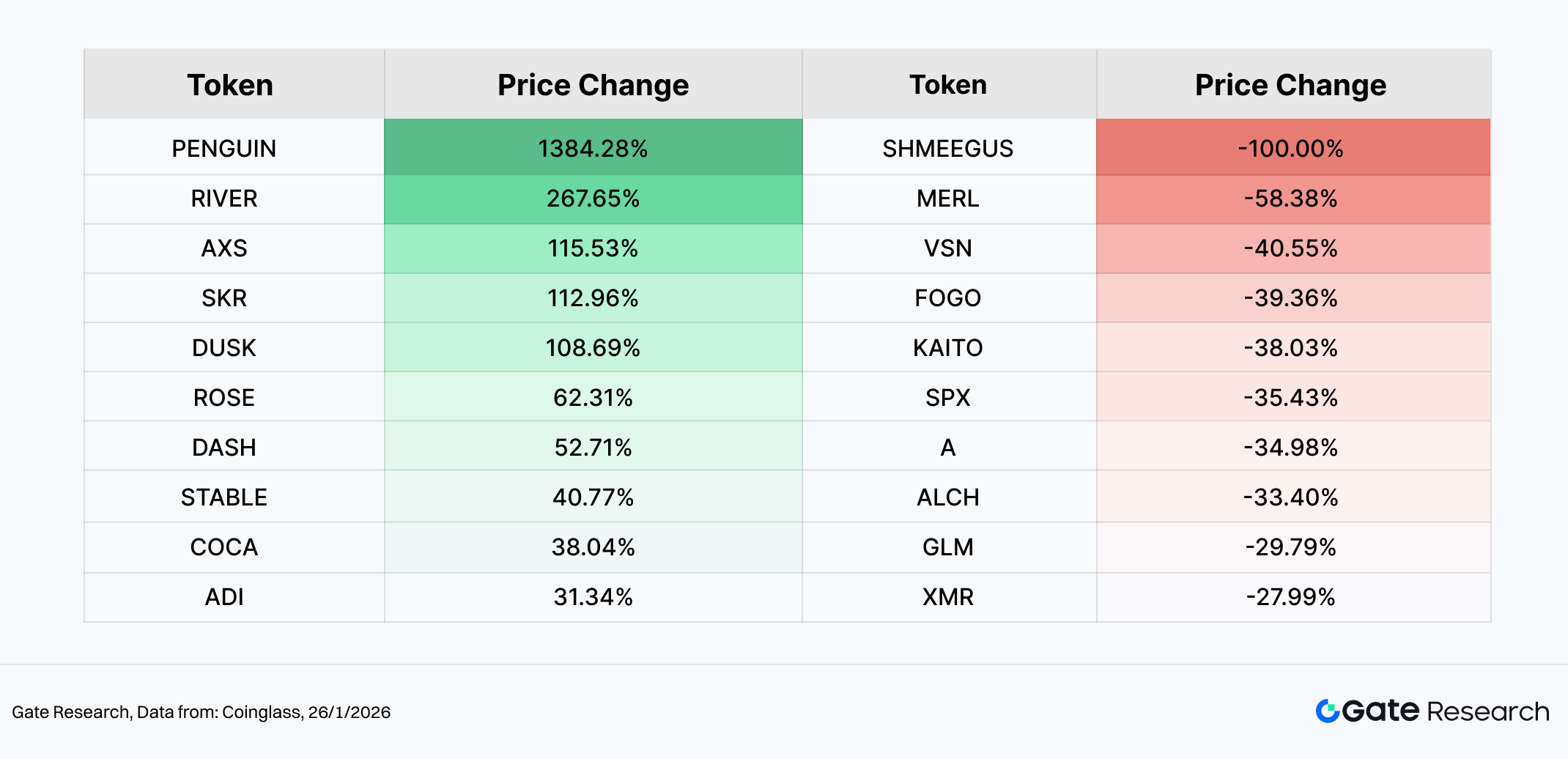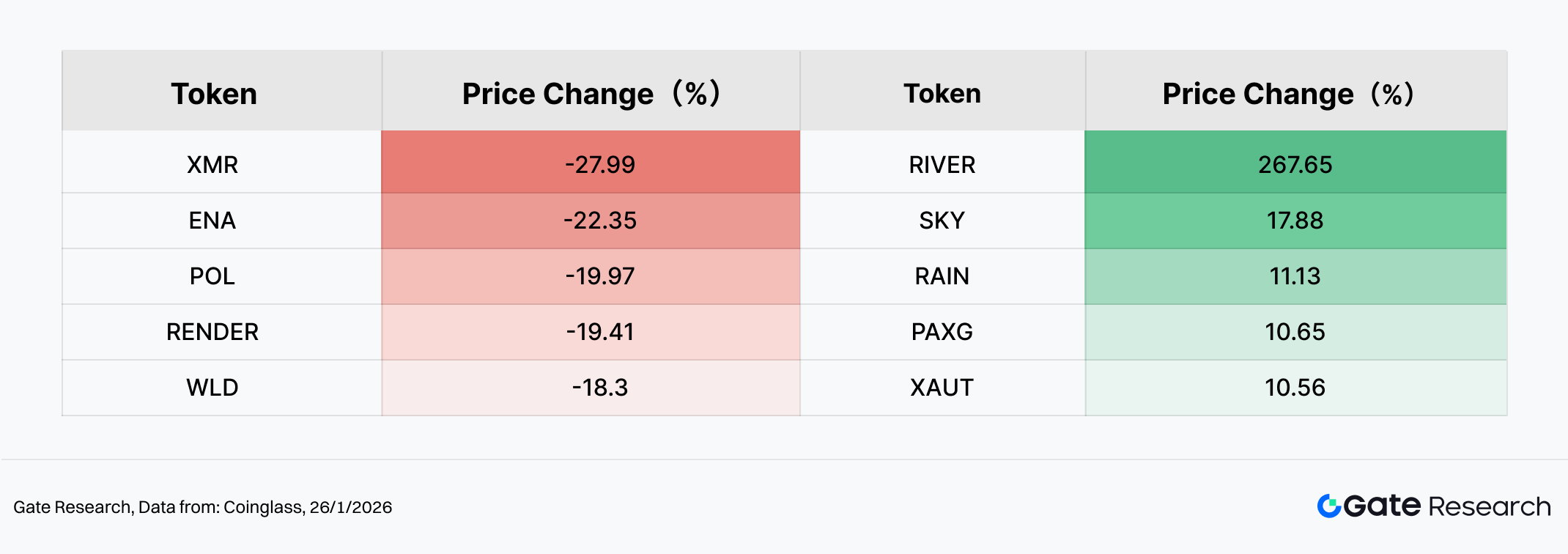 市值结构出现明显分层:前 400 名代币小幅回调,而 401–500 名小市值板块逆势上涨,短线资金转向高弹性标的。个币方面,PENGUIN、RIVER、AXS、SKR 等在社群动能与事件催化下大幅走强;相对地,部分前期高 Beta 题材显著回撤,体现情绪快速轮动。Top100 中,RIVER 受融资与合作利好推动领涨,PAXG、XAUT 等链上黄金资产同步走强,反映避险需求上升。