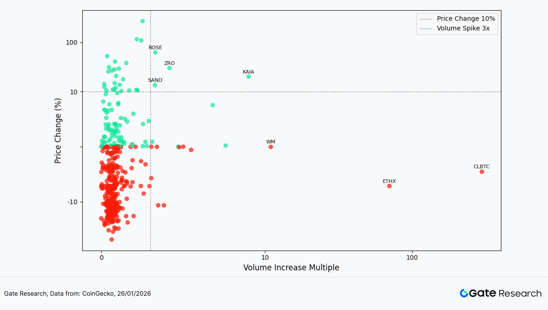 在延续成交量异动项目的观察基础上,本文进一步结合价格表现,绘制了成交量增长倍率(Volume Increase Multiple)与价格涨跌幅(Price Change %)的散点分布图。横轴代表代币在过去两周成交量相较基准期的增长倍数,纵轴为同期价格变动百分比,并采用对称对数坐标轴,以清晰呈现“放量”与“涨跌”间的结构关系。