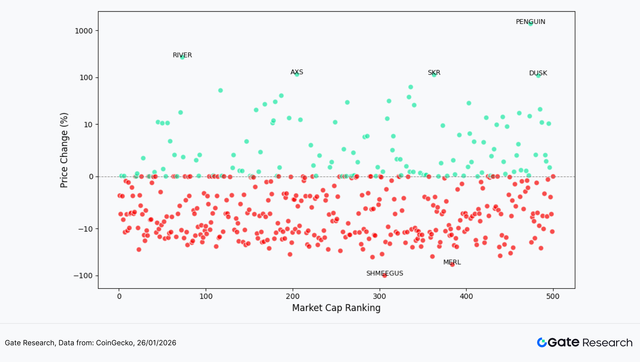 为观察本轮行情中代币表现的结构特征,本文绘制了市值前 500 名代币的散点分布图。横轴为市值排名(越靠左市值越大),纵轴为 1 月 13 日至 1 月 26 日期间的价格涨跌幅。图中每个圆点代表一个代币,其中绿色代表上涨、红色代表下跌。