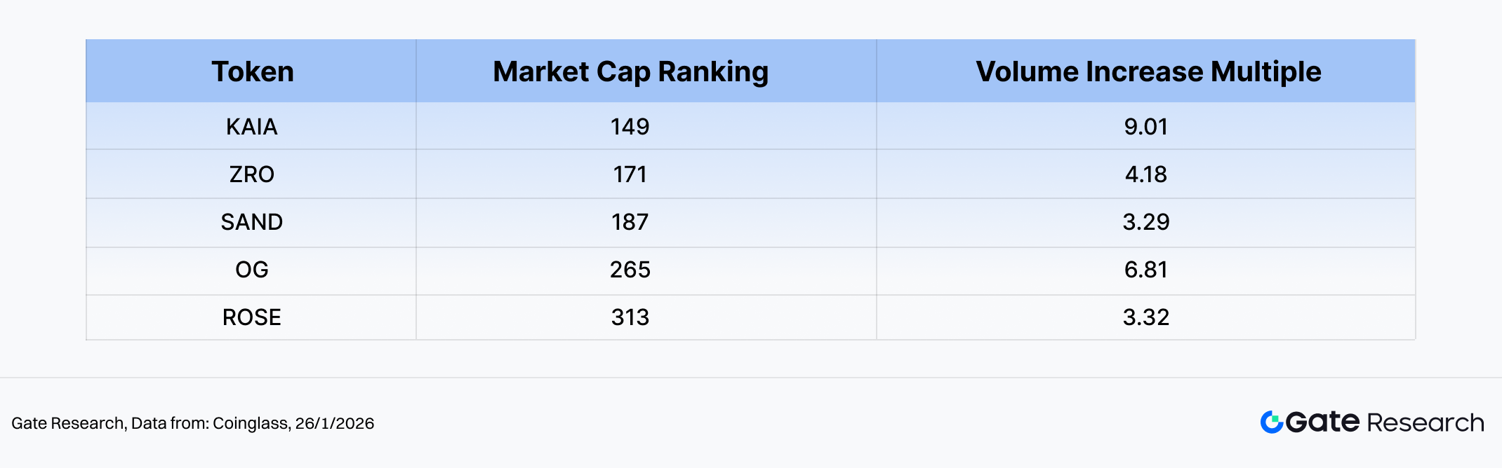 除价格表现外,本期部分中市值代币出现明显放量迹象。以启动前成交量为基准,KAIA、ZRO、SAND、OG 与 ROSE 的成交量分别放大 3–9 倍,显示资金阶段性回流、市场活跃度边际回升。