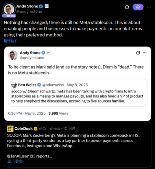 随后,Meta 发言人 Andy Stone 发推表示,「一切照旧,目前仍然没有 Meta 的稳定币。Meta 计划于 2026 年下半年重启稳定币业务这件事的重点在于,让个人和企业能够在 Meta 的平台上使用他们偏好的支付方式进行付款。」