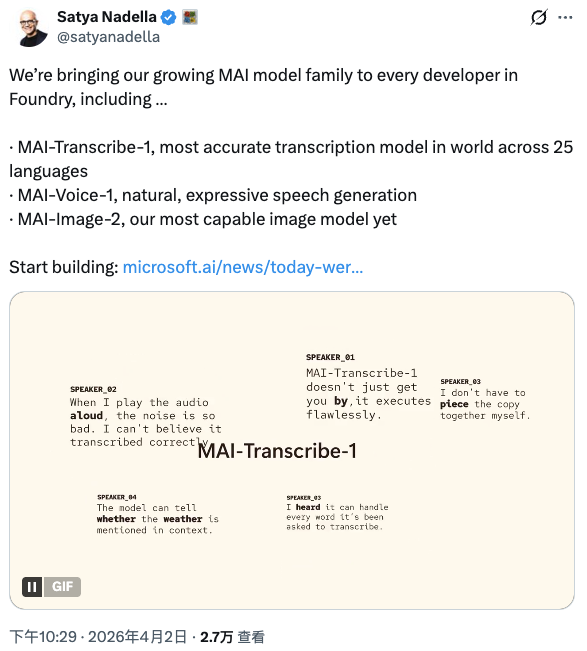 具体来说,微软AI超级智能团队开发的MAI-Transcribe-1、MAI-Voice-1和MAI-Image-2三款模型,涵盖了企业AI中最具商业价值的3项能力——语音转录、语音生成和图像创建。